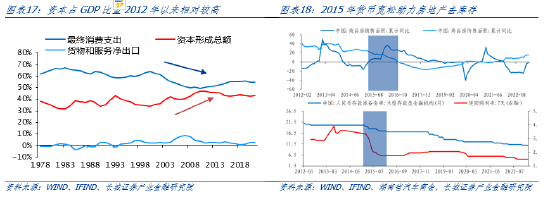“四万亿计划”带来产能过剩、低效投资等负面效果已经在这一阶段前期集中表现,PPI开启从2012年长达5年的持续负增。产能利用率相对较低。虽然从2013年开启供给侧改革化解了部分工业产能过剩的问题。但2015年开启的房地产去库存政策又促使居民杠杆率快速的大幅上扬,造成了当下消费倾向下降、储蓄意愿抬升的需求不足状态。这一阶段资本形成额占GDP比重从2000年的低点33.7%上升至2012年的最高47%,之后一直维持在43%的相对高位,对消费支出形成挤压。再叠加三年疫情冲击,居民和企业资产负债表受损,供给过剩问题逐渐显现。其中工业企业和房地产的供给过剩问题较为突出:2023年3月我国工业产能利用率74.3%,明显低于过去十年均值的75.6%;同期商品房待售面积累计同比15.4%,重新上升到2016年以来的高点。实际上以房地产施工+新开工-竣工衡量的房地产广义库存2021年就达到历史高点的107.3亿平方米,2022年末才小幅下降至93.9亿平方米,这对于2022年13.6亿平方米的商品房销售面积来看仍然是相对过剩。