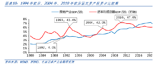 第二阶段是1991年至1999年。此时正处于商品房市场化改革时期,房地产热逐渐兴起,带动投资、信贷过热。1991年底,为了搞活国有大中型企业,国务院发布20条重要措施,包括进一步下调利率,此后信贷投放再次较快增长。1992年房地产改革全面启动,以海南为代表的房地产泡沫代表了此时的经济过热程度。房地产业业GDP占比在1992年以后维持在4%左右的相对高位,资本形成总额占GDP比重在1993年达到43.3%的阶段性高位。这期间通胀再次走高,1993-1995年CPI与PPI重新上升至两位数的高位,而产出缺口在1994年达到4%的阶段性高点。