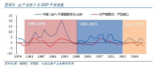 产出缺口是指现实产出与潜在产出的差值占潜在产出的比率。经济学中对产出缺口有较多的估计方法,其中一种即为生产函数法,利用生产函数计算潜在产出增速,进一步求产出缺口。我们在前期报告《中国潜在经济增速初探》中利用柯布-道格拉斯生产函数对中国潜在经济增长率进行了估算和预测。可以看出历史上实际GDP同比增速围绕潜在GDP增速上下波动,两者差值可以大致显示当时经济运行状况。比如当实际经济增速高于潜在增速往往表示经济“过热”,此时大概率下会发生通货膨胀。本文我们在前期测算的潜在GDP增长率基础上,推算潜在产出Y(p),其与实际产出Y(r)之间的差额可以大致衡量产出缺口(产出缺口比率[Y(r)-Y(p)]/Y(p)定量表示产出缺口),下文我们将生产函数法产出缺口简称为生产法缺口。
