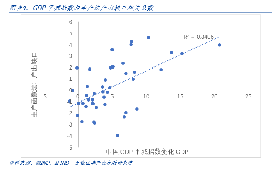 我们将两种产出缺口与价格对比,无论从走势上看,还是线性回归结果,生产法缺口对物价的指示都更加敏感。生产法缺口与GDP平减指数更加接近,1985年、1995年、2007年左右物价的峰值与生产法缺口的峰值有较好的同步性。如果直接将GDP平减指数与生产法缺口/滤波法缺口分别做简单的散点图,从线性回归的结果来看,通胀对生产法缺口的反应更加敏感。
