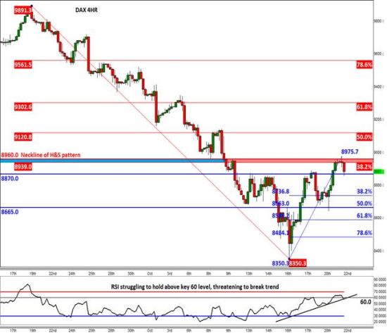DAX四小时图呈现真地下跌时可能提供支撑的潜在短线支撑位。最近涨势的38.2%回调位在8735/7点,然后是前阻力位-支撑位8665点。同时RSI也难以守住60关键水平,这是上涨趋势确认的阈值,并正威胁着下破其上涨趋势线。