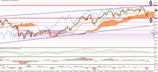 技术上, 如周线图所示,澳洲ASX200指数处于6年来的上升通道上方,虽然前期上行速度放缓,但是脚下支撑也非常扎实。价格在5018至5700之间,仍然以上行走势为主要行情。5018点的强势支撑三次测试而未破,因为那里有Fibonacci 261.8, 一目均衡云系统支撑,以及前期高点等等参照,使得此位置的支撑有依有据,自然对再次强势上涨充满期待。所以,价格是否会突破前期高点阻力5700(那里有Fibonacci 423.6 以及上行通道顶部),将是聪明的投资者最应该关注的。