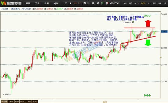 从澳元兑美元30分钟走势图上可看出,澳元兑美元经过一轮上涨后进入了上升三角形的调整阶段,预计在美联储公布决议及声明前,这种调整将持续。上方关注压力位0.8870一线,下方关注0.8840的支撑,投资者可在该区间高沽低渣。但临近美联储公布利率决议及声明时,建议投资者等待决议给出方向后再顺势下单。
