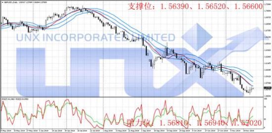 技术方面,上图为英镑兑美元日线图,从图形走势上看,英镑汇价运行在布林带上方,受布林带上轨支撑,布林带呈现整理趋势,RSI在50中值下方,MACD在0轴下方,操作上注意仓位,谨慎做空。支撑位1.56390、1.56520、1.56600;阻力位1.56810、1.56940、1.57020。