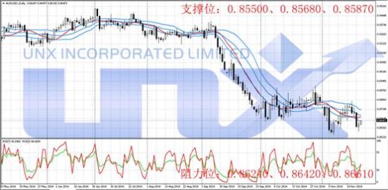 技术方面,上图为澳元兑美元日线图,从图形走势上看,澳元汇价运行在布林带上方,受布林带上轨支撑,布林带呈现整理趋势,RSI在50中值下方,MACD在0轴下方,操作上注意仓位,谨慎做空。支撑位0.85500、0.85680、0.85870;阻力位0.86240、0.86420、0.86610。