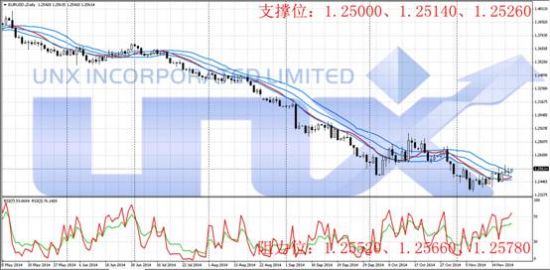技术方面,上图为欧元兑美元日线图,从图形走势上看,欧元汇价运行在布林带上方,受布林带上轨支撑,布林带呈现整理趋势,RSI在50中值下方,MACD在0轴下方,操作上注意仓位,谨慎做多。支撑位1.25000、1.25140、1.25260;阻力位1.25520、1.25660、1.25780。