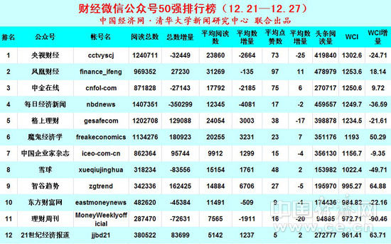 中国经济网北京12月31日讯(记者 王猛)今天,中国经济网联合清华大学新闻研究中心发布《财经微信公众号50强周排行榜》(12.21-12.27),央视财经(cctvyscj)仍居榜首,一周阅读总数为1240711次,平均阅读数为23860次;中国经济网(ourcecn)位列第24名,一周阅读总数为129966次,平均阅读数为3938次。