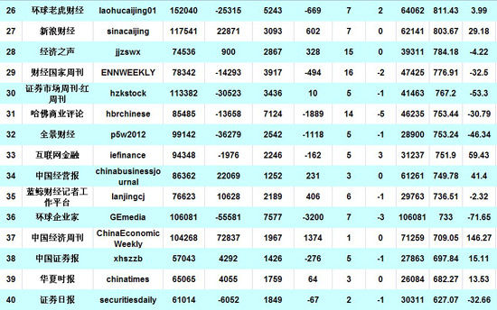 3、微信财经公众号榜单均以7天为一个周期,以全国主流财经媒体和部分知名商业财经机构所开通的微信公众号为样本,依据微信指数WCI为最终统计标准,筛选出全国前50家财经类微信公众账号。