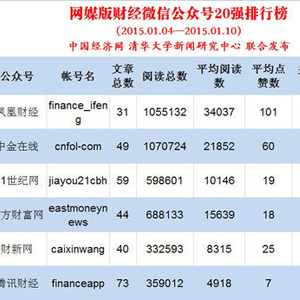 中国经济网北京1月14日讯(记者 王猛)中国经济网联合清华大学新闻研究中心今日发布《财经媒体微信公众号20强周排行榜》及《每周财经微信热门文章排行榜》(2015.01.04-2015.01.10),榜单根据微信公众号的媒体属性,分为网媒版和纸媒版。
