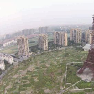 于2001年就拿到7000亩地的广厦杭州天都城,目前开发体量仅仅只有总规划的一半左右。图为高108米、3:1比例建造的山寨版“埃菲尔铁塔”至今依然屹立菜地中央。