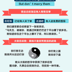 马云:我喜欢打太极,太极代表着阴阳相生的哲学。这是一种关于平衡的哲学。比方说市场竞争,有人说,你现在跟eBay竞争,你会不会讨厌eBay,我说绝对不是,eBay是一家优秀的企业。这是一推一档的关系,太极就是如此,你来这里,我去那里,你攻上路,我攻下路。这就是平衡。虽然我个子小,但我可以腾跃,你就无法腾跃。太极代表的就是这样的哲学。我在业务中也运用这样的哲学,首先要静下心来,一切都会有结局。要保持自身的平衡。同时,业务竞争也有乐趣在其中,这并不是战场,一定要拼个你死我活。有人倒下,也不见得一定有人赢。太极就是寻求这样的平衡之道。