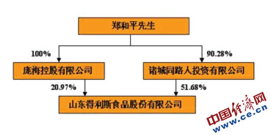 郑和平控制的两家企业诸城同路人投资有限公司和在境外设立的庞海控股有限公司共拥有得利斯72.65%的股权。