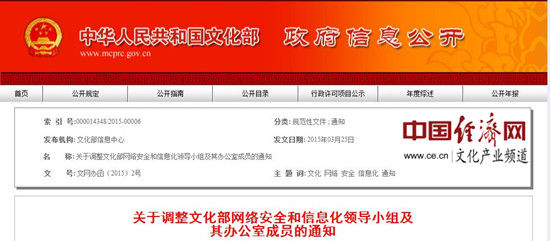 据中国经济网文化产业频道记者了解,为加强对文化部系统网络安全和信息化工作的领导,2014年10月,经文化部党组研究决定,成立文化部网络安全和信息化领导小组,全面负责文化部网络安全和信息化工作。