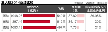 不过三大航的大部分收入仍然是在国内。2014年,国际航线最多的国航在国际航线上的收入占到主营业务收入的36.95%,而南航和东航的国际航线收入则分别只占到21%和30%。
