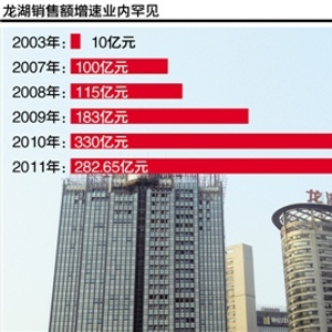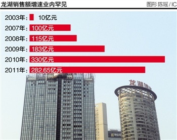 迈开全国化步伐后,龙湖地产进入规模高速增长期。2003年,龙湖销售额仅有10亿元,但2007年已突破百亿,5年内增长10倍。2008年115亿,2009年达到183亿,2010年飞升至330亿,2011年为382.65亿。这几年的增速业内罕见。