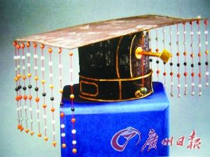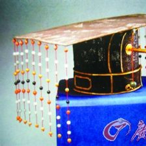 九旒冕,制于明洪武前期,由冠武、金簪、綎板、旒等部分组成,竹、木、丝、金、铁、玉石及大漆等多种材料复合制作,冠武直径17.6厘米、高17.9厘米,綎板长49.4厘米、宽23.5厘米,现藏于山东博物馆。