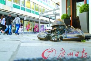 看看,就连贴满广告的路牌,也可以展现得很有文艺范。听说这座城市里有几座有意思的雕塑是不可不看的,于是在城中转了一圈后,终于找到了其中一座-“古米”。这是老城区里面众多反映平民形象的街头雕塑里人气最高的,他就是“水道工古米”,只见在地上,头戴着头盔的工人雕塑正掀开井盖,从下水道口探出身子,趴在井口看来往的行人,圆圆的脸上露出了微笑,第一眼看到就觉得真心喜爱。
