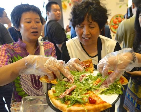中国经济网北京6月25日讯 (记者 陈小力) 玫瑰般半透明色泽的意大利珍宝级火腿,薄切大片,铺陈于清爽的芝麻菜上,均匀撒上新鲜现刨的进口格拉纳帕达诺干酪。这是必胜客6月推出的新菜单中其中的一款比萨。6月24日,必胜客在北京工体北路一家餐厅邀请消费者品尝新款美食。