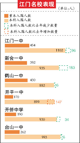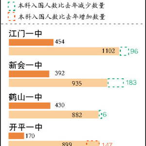 值得注意的是,今年江门各名校的本科入围人数较去年有所减少,新会一中本科入围人数更是比去年减少183名。而开平一中“逆势”上涨,今年高考中该校的本科入围人数就比去年增加了147人,增长率达到了19.5%。