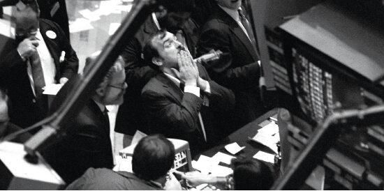 黑色星期一后,美国总统里根、财政部长贝克相继发表声明稳定市场,导致股灾并未严重影响美国经济。图为纽交所内交易员对行情感到惊讶。