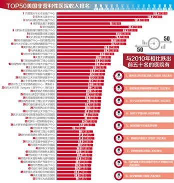 美国非营利性医院整体来看,40亿美元已经成为进入50强俱乐部的一个基本标准。这五十家美国的非营利性医院的排名是基于其总收入多少,数据则是来源于CMS关于医院运营成本报告分析所得,其中数据主要是基于短期急症医院、重症医院和儿童医院分类的医院。
