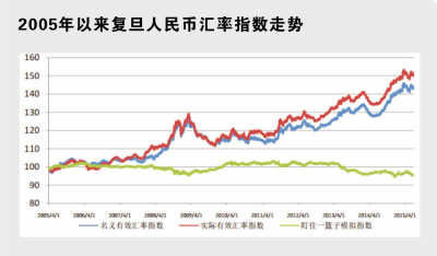 2011年最后一个季度,有效汇率指数加速上升,全年涨幅7%。2012年复旦人民币指数处于历史高位小幅震荡,整体运行基本平稳,复旦人民币名义和实际有效汇率指数年初小幅攀升,年末又有所回落。2013年人民币有效汇率再度呈现走高态势,创下了历史新高。进入2014年后有效汇率指数展现了较大的波动性。在第一季度前半段,有效汇率指数创下新高,此后受国内外多种因素影响人民币汇率指数一路下行直至二季度中。从7月份开始,人民币开始新一轮升值行情,人民币汇率指数再创历史新高。