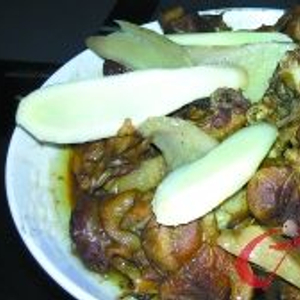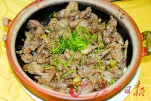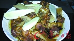 “子姜焖鸭”是地处湘粤交界的乐昌梅花一带著名的地方菜式之一,许多南来北往的客商都必点此菜。