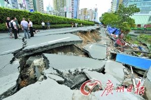 季华路出现塌陷!昨日7时许,在季华五路万科广场工地一侧辅道,忽然出现长约60米、宽约15米塌陷,场面甚为吓人。万幸的是,事故并没有造成人员伤亡。禅城区政府随后通报,事故原因应是万科广场工地南侧基坑支护坍塌导致。据了解,该基坑附近塌陷已非第一次,而在此次事故发生前一晚,部分市民已经发现路面出现裂缝及倾斜。