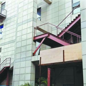 据商场负责人介绍,由于2楼到3楼的位置,消防通道的宽度不达标,目前商场还没通过消防验收,现在商场方面唯有做一条加建在墙体外面的消防梯,并不会影响承重墙和大楼结构。