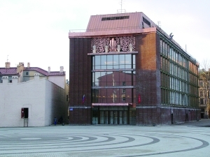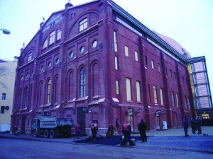 马林斯基音乐厅在外观上,依然完整地保留了老商场劫后的残墙断壁,烧毁的大部分外墙则用现代建筑材料——钢板、水泥、玻璃,按照老商场的原尺寸复原。后门是劫余部分,外墙由粗泥烧制的红砖砌就,老式的门窗和路灯,仿佛时光倒流在百年前的圣彼得堡街道,转到正门与残墙粗砂规整度很差的红砖墙相呼应的是现代工艺质地细腻的红砖立面墙和高大的落地玻璃罩大门,给人以凤凰涅槃式的浴火重生的深刻寓意。如果与汉堡易北爱乐音乐厅相比较,马林斯基音乐厅的外观相当朴素低调。