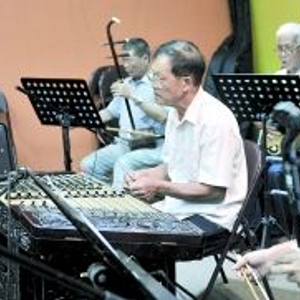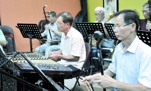 ▲老年人在一起弹唱粤剧曲目。