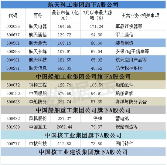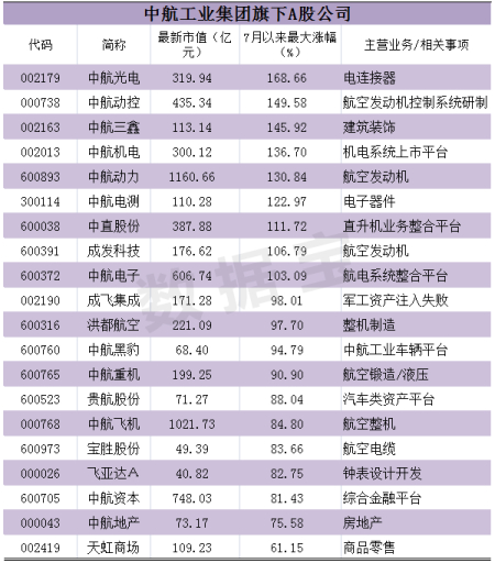 巧合的是,中航集团增持的重点公司,大部分有实质性军工业务,比如主营航空整机业务的中航飞机、航天机电产品的中航机电、航电系统的中航电子等等。无独有偶,这类个股也正是反弹的主要标的。中航动控、中直股份、中航飞机、成发科技、中航动力等多只个股7月以来最大涨幅超过100%。