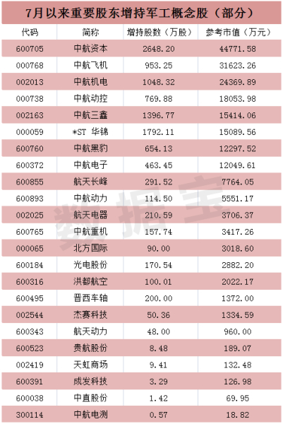 航天军工概念板块频频大涨,除了市场热烈预期的资产重组利好外,或与近期中航集团大手笔增持旗下上市公司股份也有一定关联。据数据宝小编统计,7月以来中航系旗下上市公司累计被重要股东增持市值超过17亿元(未计入董高监增持数据)。其中中航资本被重要股东增持超过4.4亿元,此外中航飞机、中航机电、中航动控、中航三鑫、中航黑豹、中航电子等6只个股被重要股东增持超过亿元。