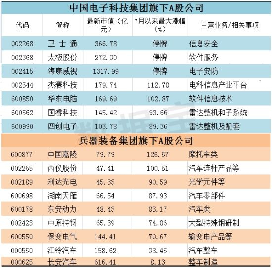 截止到最新,兵器工业集团旗下北方创业、江南红箭两只个股停牌,航天科技集团旗下航天电子停牌,中国电子科技集团旗下卫士通、太极股份、海康威视3只个股停牌;中船重工旗下风帆股份停牌。根据已经披露的信息,北方创业、航天电子、风帆股份3只个股均涉及到资产注入,江南红箭则是实际控制人正在筹划与公司相关的重大事项。