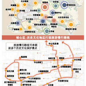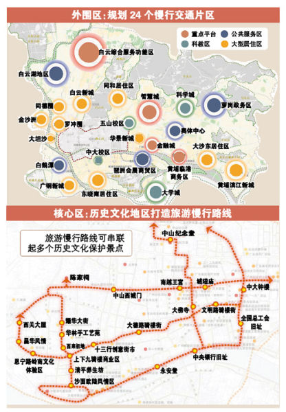 核心区:针对城市不同的用地特征,进一步提出针对历史城区、老城商业区、新城商务区、交通枢纽地区与居住地区分别制定适宜的规划方案。在历史文化地区,打造串联各历史文化保护景点的旅游慢行路线,未来可以骑着自行车游沙面、上下九、恩宁路,沿着中山路从陈家祠一路骑行到烈士陵园;在老城商业区,加强精细化设计、优化地面铺装与绿化。