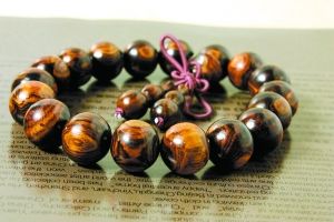 仅从木质上来说,印度小叶紫檀不如海南黄花梨名贵,但在红木手串中,印度小叶紫檀是其中的王者,知名度最高的手串,没有之一。小叶紫檀产于印度,生长缓慢,几百年方能成材,在明末清初时就已有“寸檀寸金”的说法。记者仔细观察了一下,小叶紫檀制作的手串红得庄重,紫得深邃,“紫气东来,这或许是国人喜欢小叶紫檀的原因。”把玩之后的小叶紫檀,包浆细腻,沉稳大气,华丽高贵,佩戴在腕上气质非凡,极品之中的满星、满瘤、满鱼鳞纹者,更是璀璨夺目。