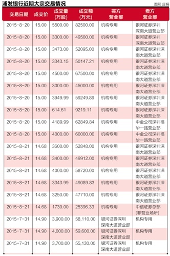 银河证券深圳深南大道营业部当时买入的浦发银行每股为14.90元,但7月31日浦发银行收盘价为15.07元,折价1.13%。