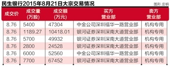与此同时,民生银行(600016.SH)也在8月21日惊现大宗交易平台,6笔交易合计达28789.27万股,交易金额25.22亿元,成交价8.76元/股,较当日收盘价8.51元溢价2.94%。与浦发银行不同的是,民生银行的卖出方全是机构专用席位。