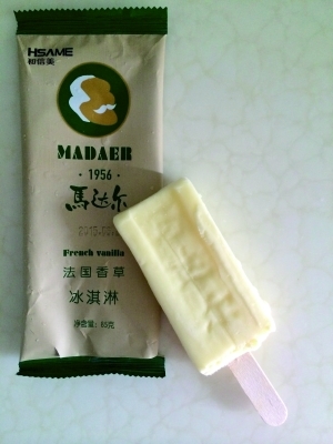 记者买了一根法国香草口味的“马达尔”冰棍,包装纸背面标注的生产者是深州市一家企业,产地为河北省,出品商是和信美食品(北京)有限公司。