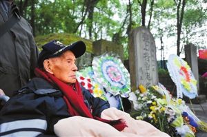 曾担任过张将军警卫员的101岁老人曹廷明坐在轮椅上绕行张自忠将军墓一周,表达缅怀之情。新华社发