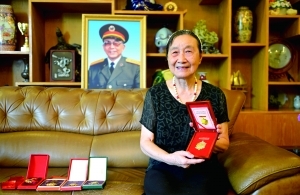 王诚汉的夫人黄丽文展示丈夫在2005年被授予的纪念中国人民抗日战争胜利60周年纪念章。