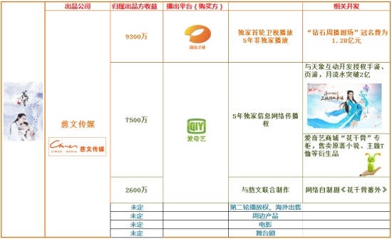 作为《花千骨》的独家制作公司,慈文传媒显然是该剧的最大受益方。光在2014年,向湖南卫视和爱奇艺出售的首轮播放权和版权收入便已高达1.68亿,而《花千骨》的投资成本为1.05亿元,毛利率约55%。