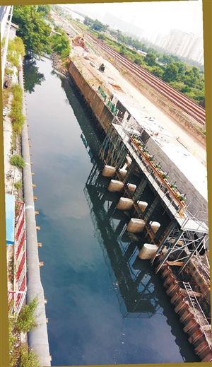 9月8日,记者来到位于南山区前海的龙海家园小区。居民们所说的河流紧挨着一排东西走向的居民楼。河流与地下停车场相距约3米远。河流上游,墨色的河水上漂浮着木条等杂物,一座小型水坝将这些杂物截留了下来。河道的北岸杂草丛生,南岸是正在施工的工地,工地废水经由排水管道直接注入这条河流。