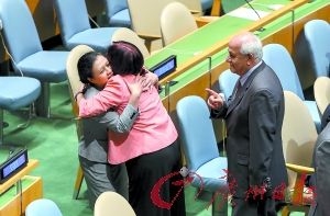美国纽约,巴勒斯坦驻联合国代表拥抱庆祝。