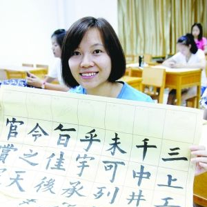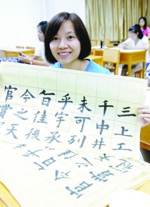 田径400米栏美女陆洁贞写得也相当不错,算得上吴水娇师妹的她非常勤奋,她说心情烦躁的时候练毛笔字,总能让自己定下心来,所以想好好练。值得一提的是,小陆还从中悟出了一点道理,她说原来练书法贪多没用,她总想写得更好,因此一张接一张地写,反而越写越差,越写越乱,这时候停下来做别的事情,回头再写就能写好了,原来跟自己训练是一样的。