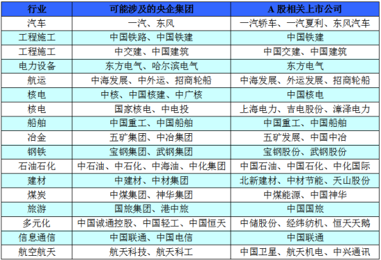 2、安信:央企兼并重组围绕两个重要维度进行安信证券首席策略分析师徐彪认为,国企改革顶层设计方案中,央企整合是政策风向和关注焦点,其认为,未来央企的兼并重组很可能围绕两个重要的维度来进行: