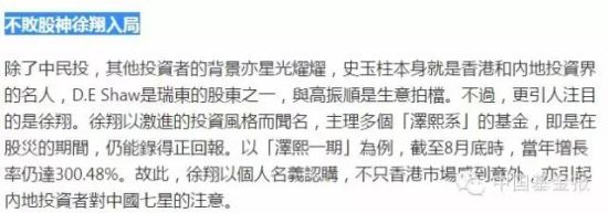 香港是怎么看待一哥徐翔进军港股的呢?基金君搜了一下,他们是这样形容一哥的:“不败股神”、“内地股坛猛人”。