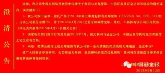近期,我公司发现在网络及微信中传播关于我司与美邦服饰、中信证券及证金公司等机构的传言,现澄清如下: