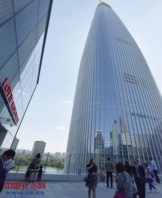 乐天世界购物城是集购物、文化、观光、休闲于一体的新概念综合购物空间,由乐天世界塔、AVENUEL名品馆、乐天Mall、乐天玛特四栋建筑组成。图中乐天世界塔设计层数123层,建筑高度555米,是韩国最高、世界第六高建筑。待2016年乐天世界塔整体完工,乐天世界购物城年销售额预计将达7万亿韩元(约385亿元人民币)。中国经济网记者 杨明摄