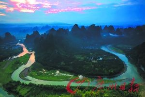 此时名闻遐迩的漓江第一湾,也终于在曙光中露出了其美丽的容颜,一个U字形大拐弯像一把巨大的弯弓葡匐在大地上,充满了无形的张力。千姿百态的山峰错落有致地点缀在漓江两畔,仿如一颗颗黛青色的珍珠镶嵌在珠链上;江心嵌有一块小小绿洲,犹如一颗绿色明珠散发着璀璨夺目的光华……